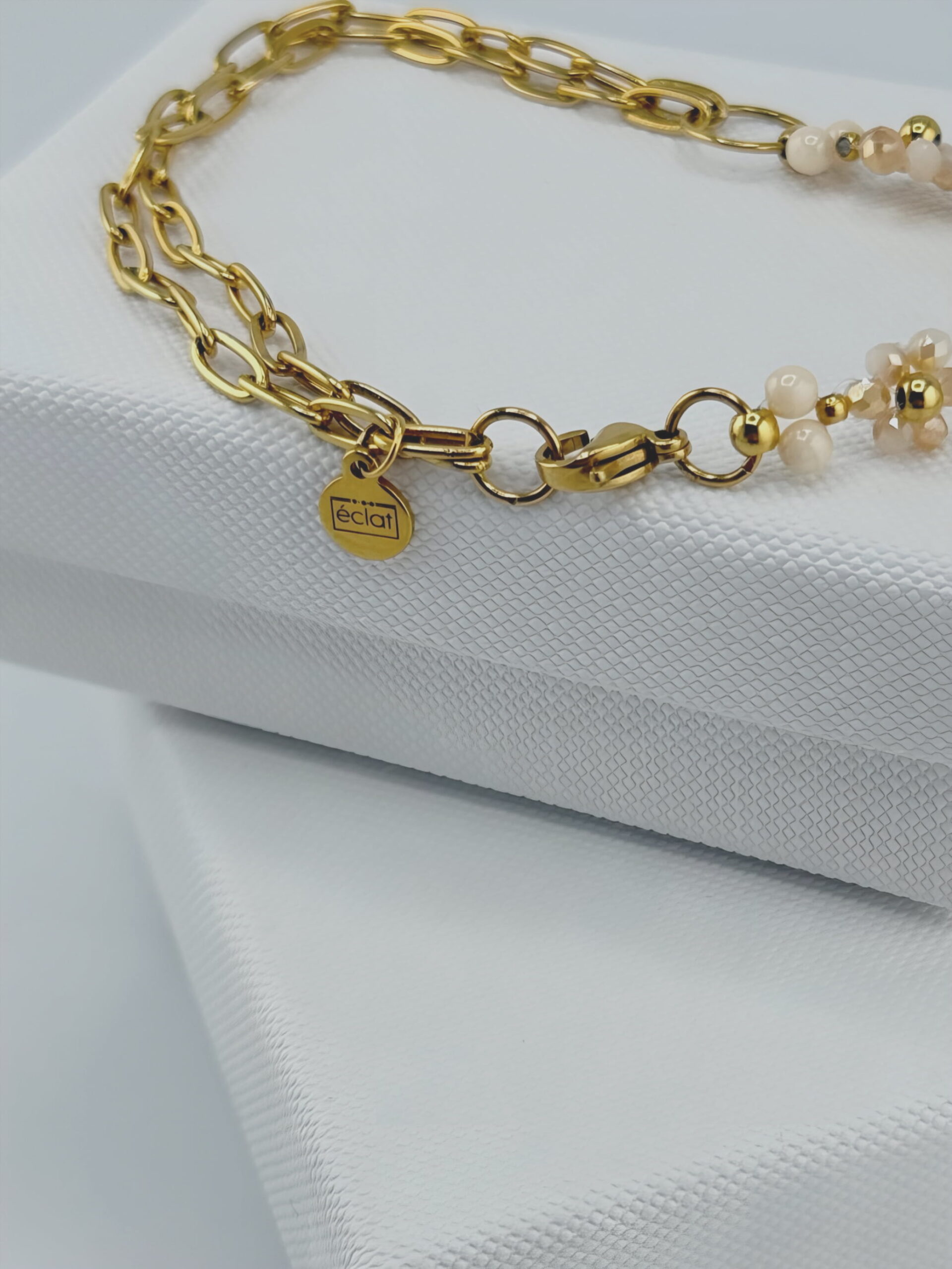 Bransoletka Brave to połączenie delikatności i odwagi – stworzona dla kobiet, które lubią łączyć subtelność z wyrazistym stylem. Jedna połowa inspirowana jest modelem Elite – ręcznie nawlekane szklane kamienie tworzą lekki, kwiatowy akcent, dostępny w trzech wersjach kolorystycznych: beżowej, różowej i białej. Druga połowa bransoletki to kontrastowy detal – dwa złote łańcuszki połączone złotym kółkiem, symbolizującym równowagę i wewnętrzną siłę.